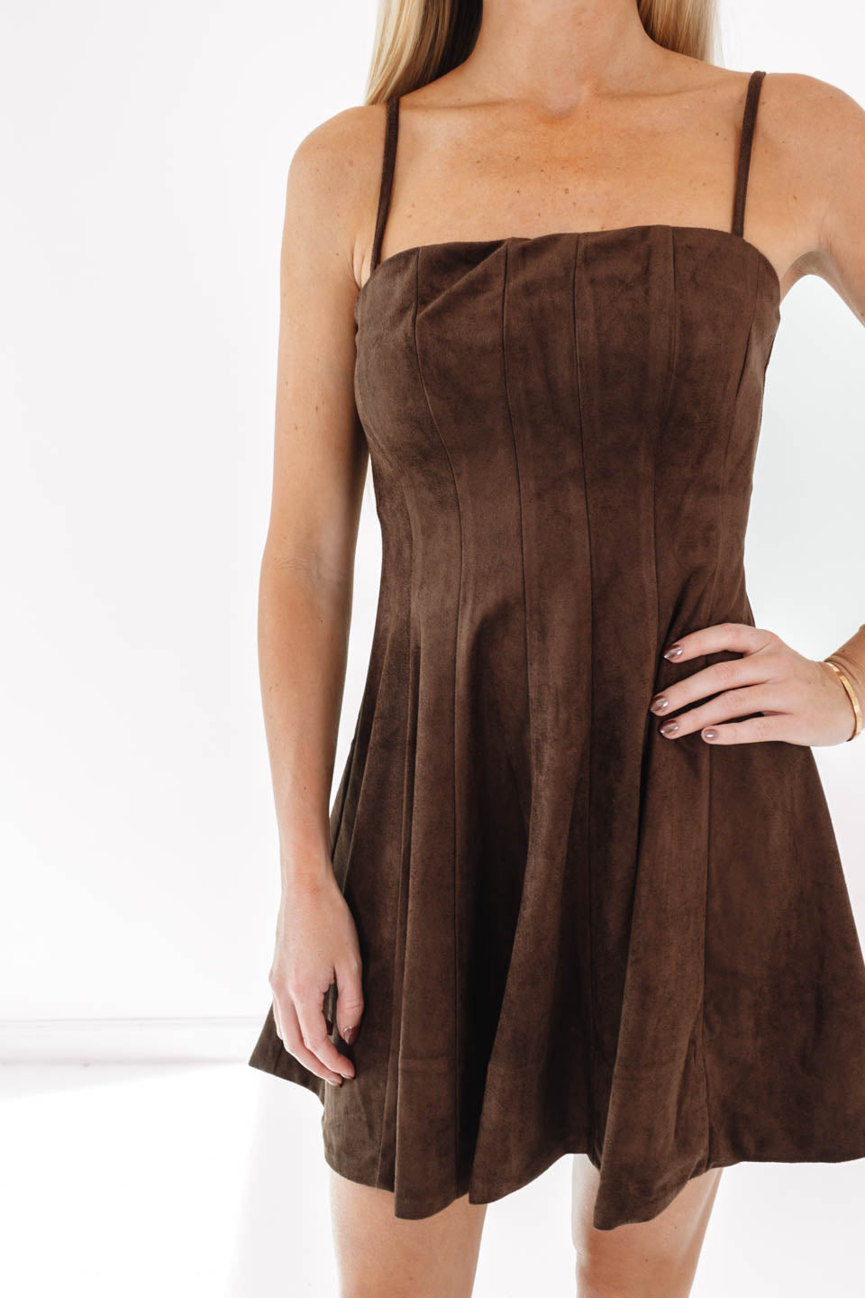 This chocolate suede mini dress is serving up major fall flair with a flirty twist! The soft, velvety texture and fitted bodice make it effortlessly chic for any occasion. Pair it with boots and gold jewelry for a look that’s as sweet as it is stunning.